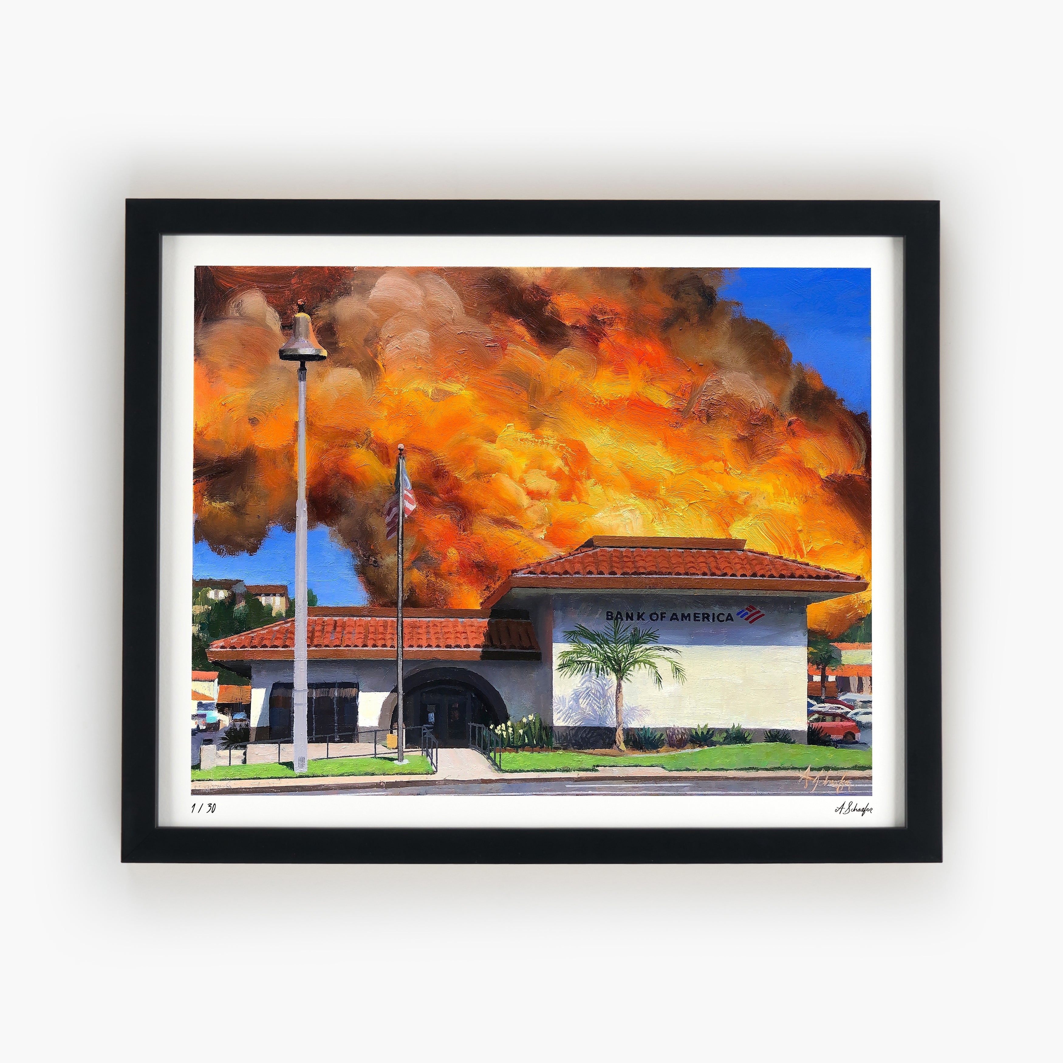 Four iconic pieces by artist Alex Schaefer from his powerful ongoing series of paintings of Banks in Flames. Otherwise everyday suburban scenes dramatically transformed by raging infernos making a cathartic commentary on financial terrorism.
